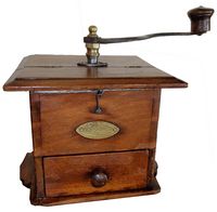 Boite carrée assemblée en queue d'aronde avec un large plateau supérieur. Ce plateau est composé d'une partie fixe et d'une partie mobile montée sur deux charnières en laiton. Un crochet visible en façade permet de maintenir fermée cette partie ouvrante.