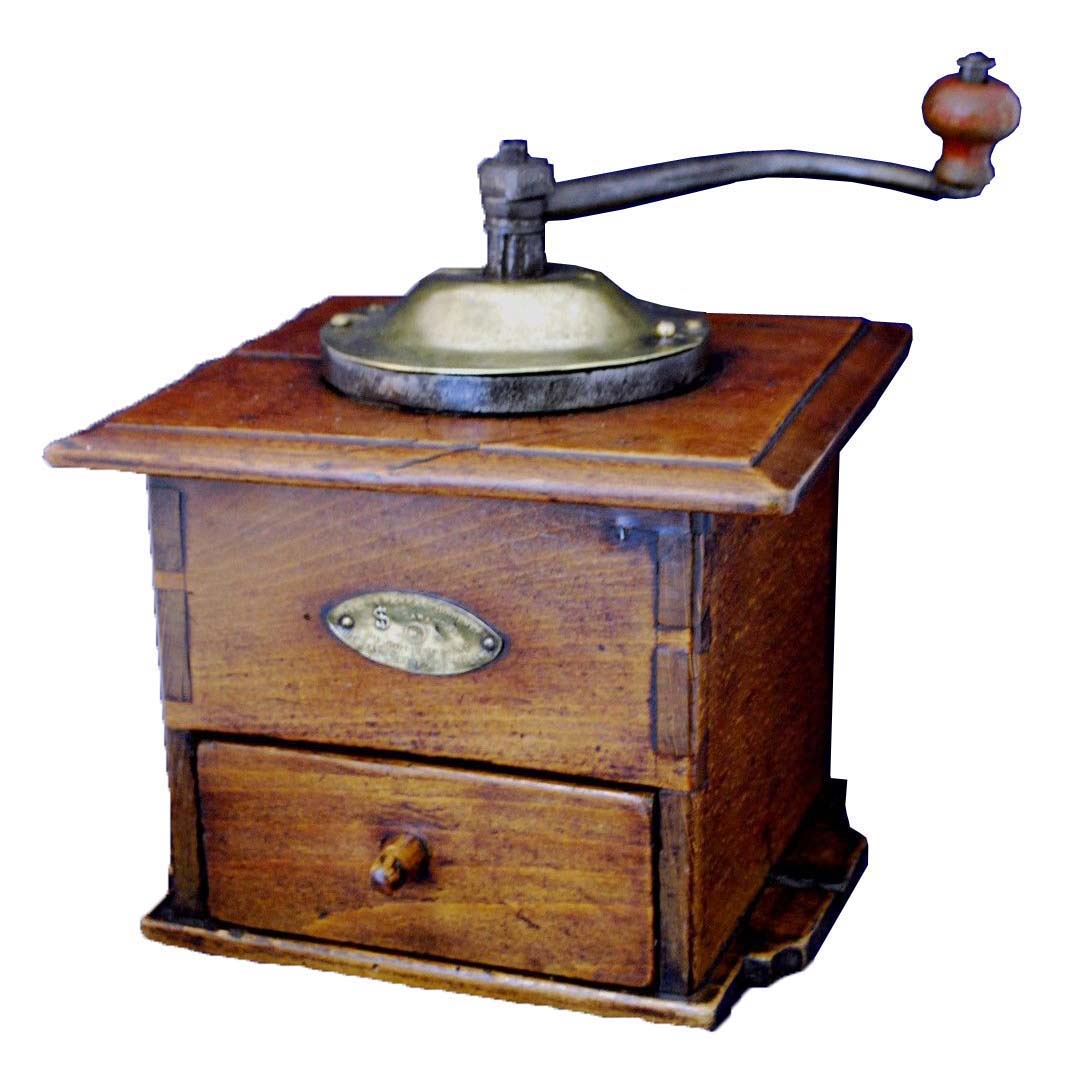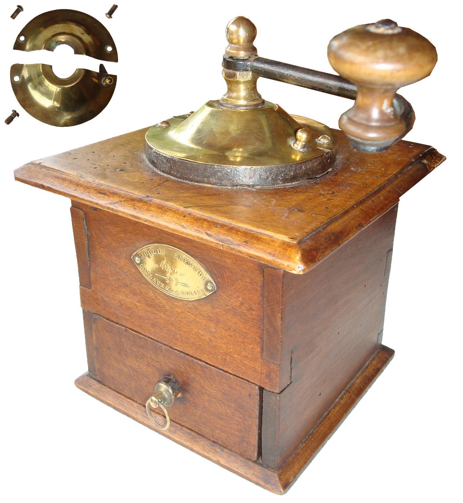 Assemblage à queues d'aronde espacées, tiroir encastré, trémie intérieure en laiton, cercle en fonte muni d'une traverse percée en son centre sur lequel sont fixées les 2 demi calottes en laiton.