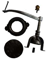 A l'autre extrémité de l'axe, en haut du moulin, on retrouve le système de réglage de type F avec toutes ses pièces constitutives : écrou cranté, levier de blocage en acier, manivelle très caractéristique, pièce conique d'adaptation à la calotte pivotante.