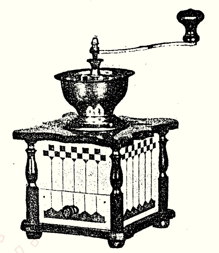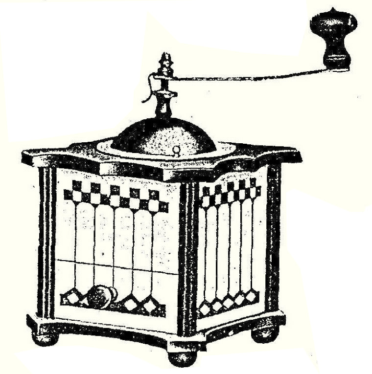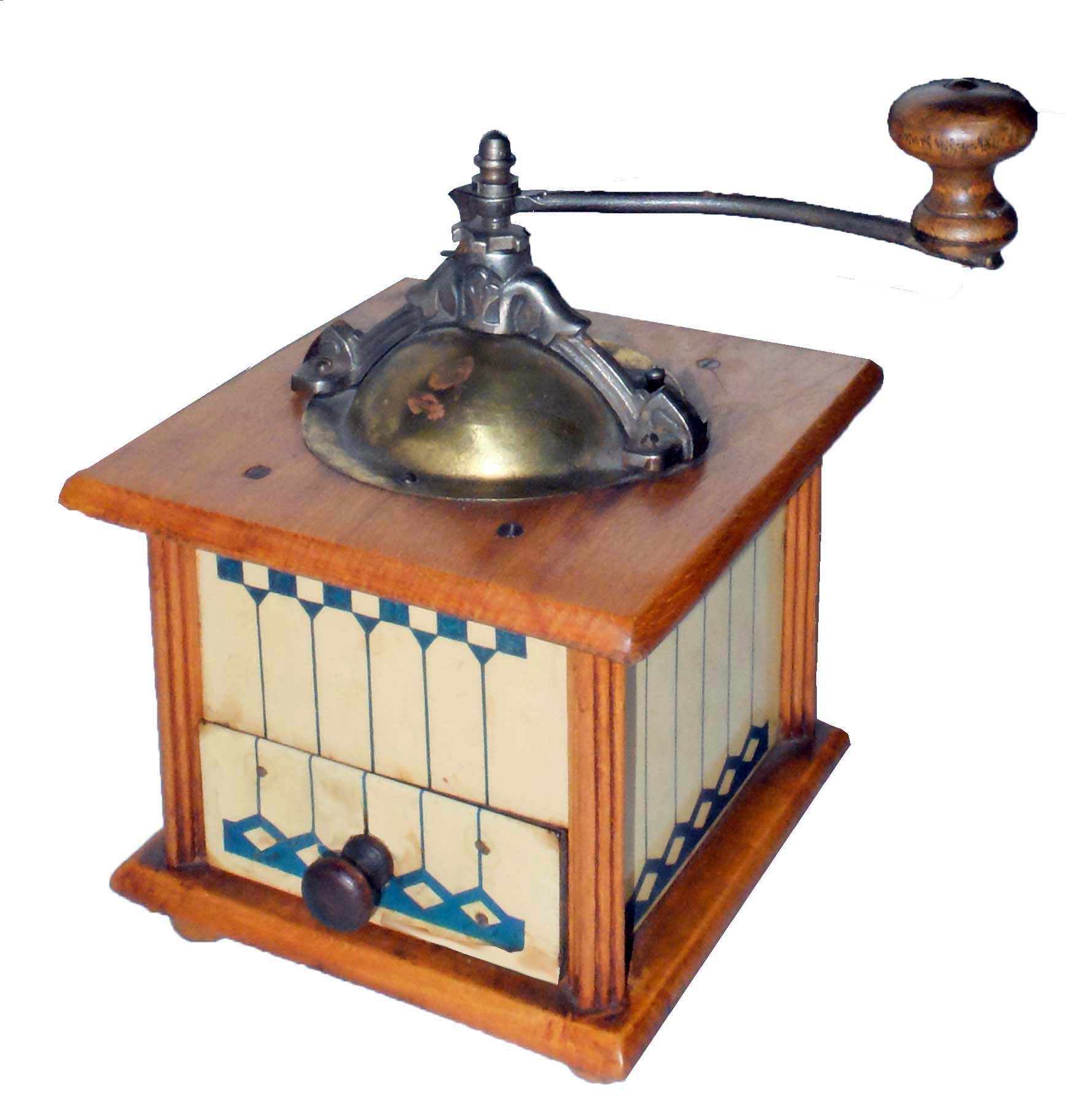 - IOK : à trémie ouverte nickelée, boite en hêtre verni à colonnes, plateau supérieur chantourné, sur pieds, manivelle nickelée courbe et ronde,