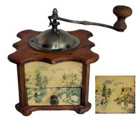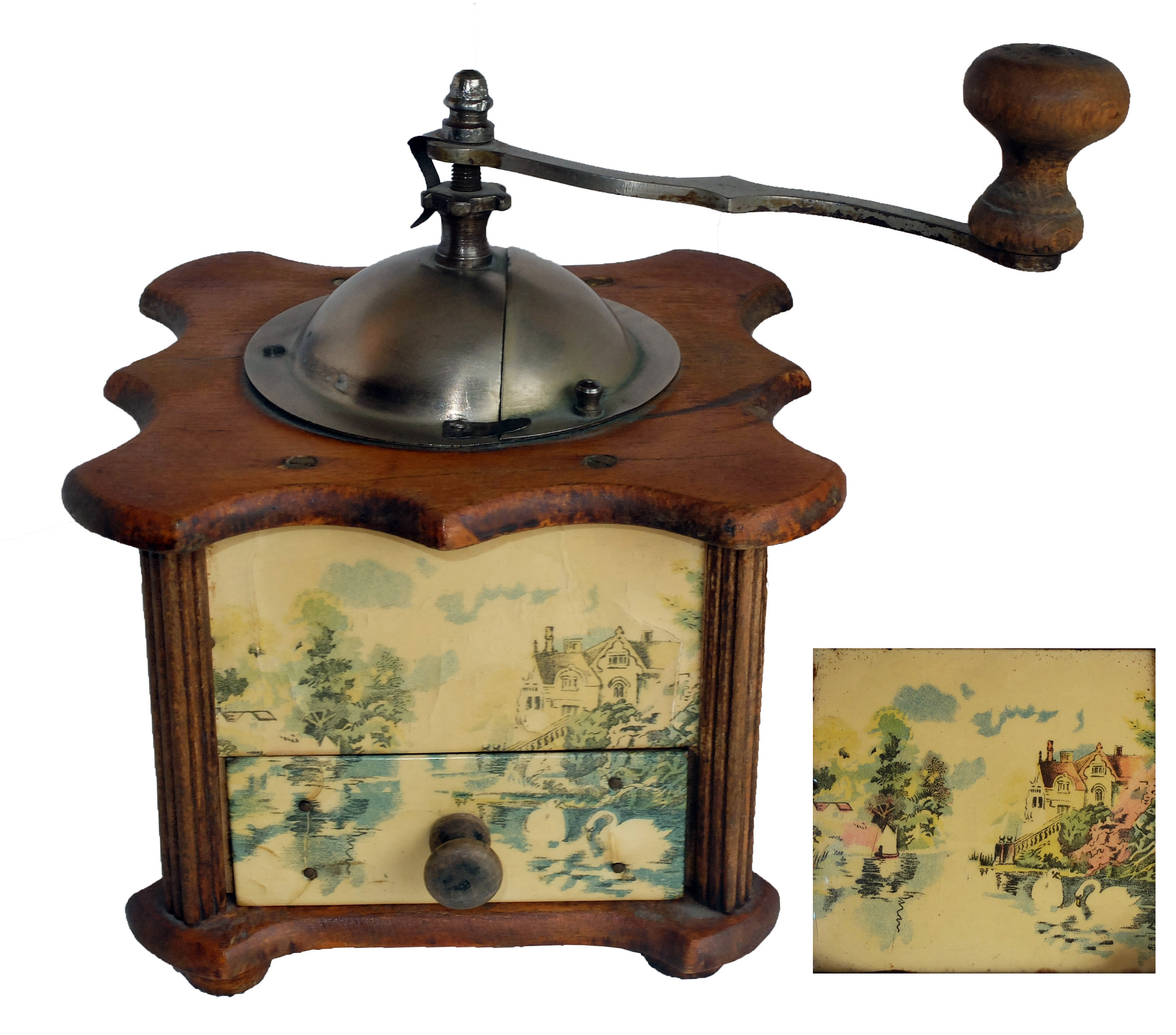 - IOD : à trémie ouverte nickelée, boite en hêtre verni à pans, plateau supérieur chantourné, sur pieds, manivelle nickelée courbe et ronde,