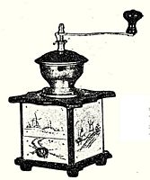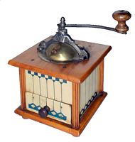 - HOK : à trémie ouverte nickelée, boite en hêtre poli à colonnes, plateau supérieur chantourné, sur pieds, manivelle nickelée courbe et ronde,