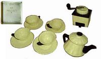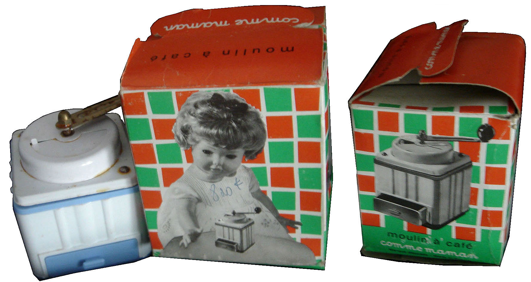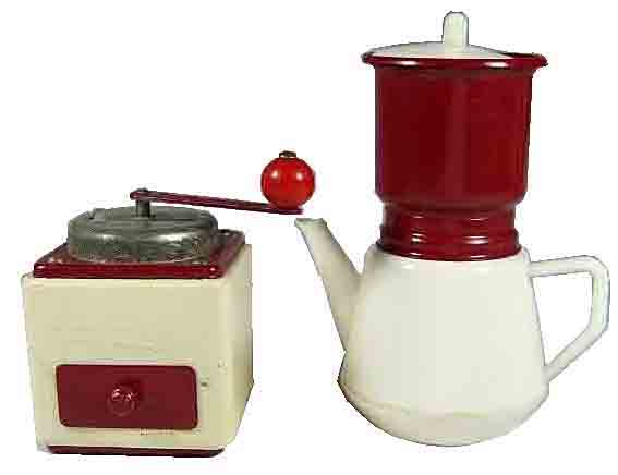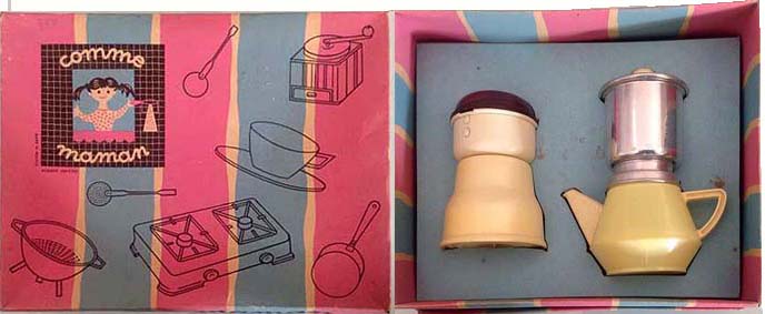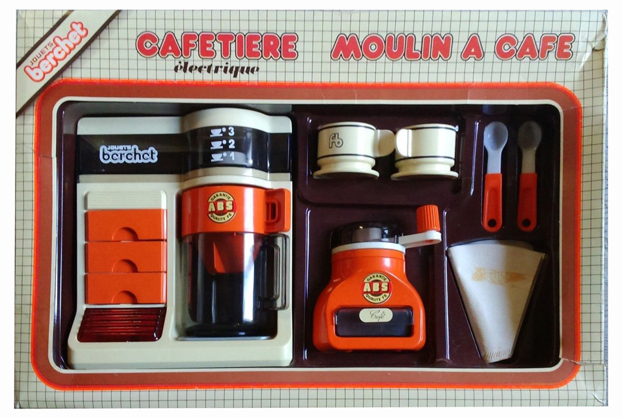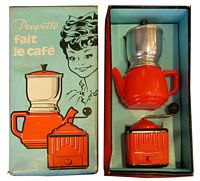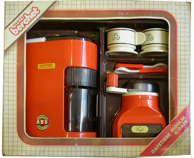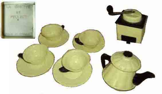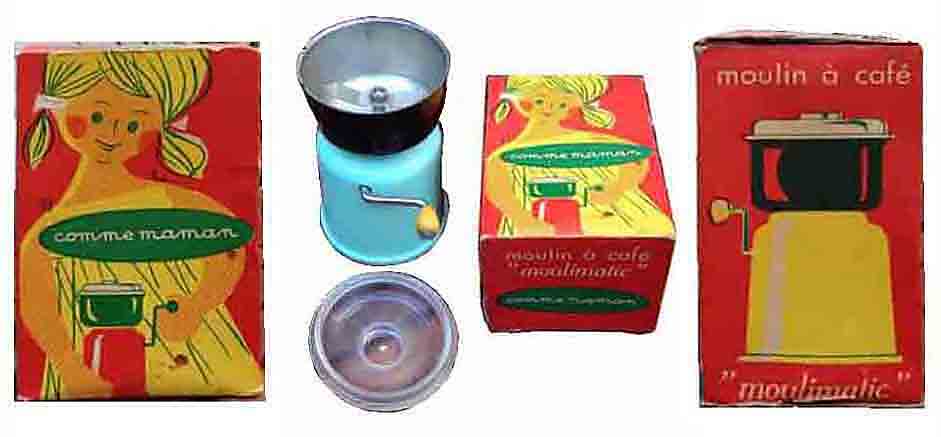 Cette page présente quelques moulins de dinette en plastique. Ils peuvent être assortis de cafetière, de plateau, de tasses ou d'autres ustensiles, et présentés en coffrets.