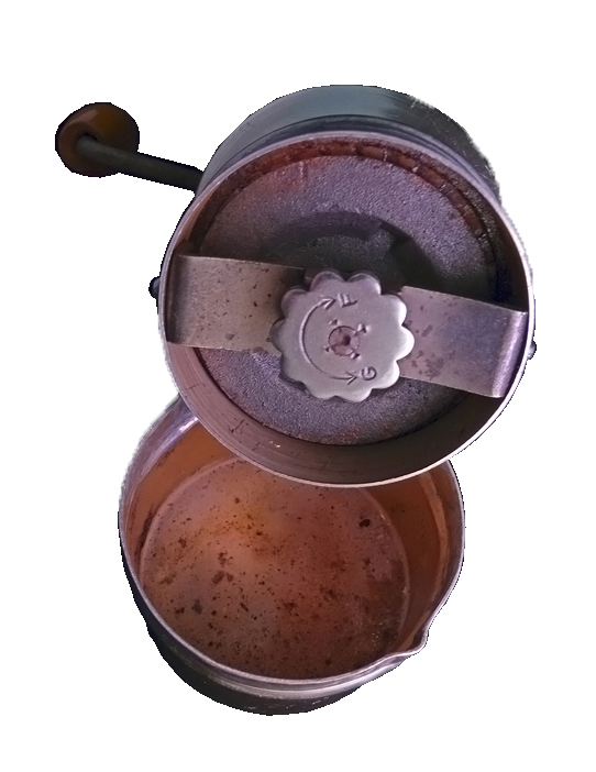 Une molette placée sous la noix permet de régler la finesse de la mouture. Son axe est fixé à un étrier vissé sur la partie haute du corps. Ces 2 vis servent à verrouiller la baïonnette.