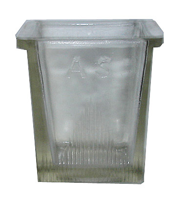 Les godets en verre 250 g et 350 g sont très hauts et débordent souvent de la planche de fixation ; ils sont marqués AS dans un cartouche, (cette marque AS est parfois absente)
