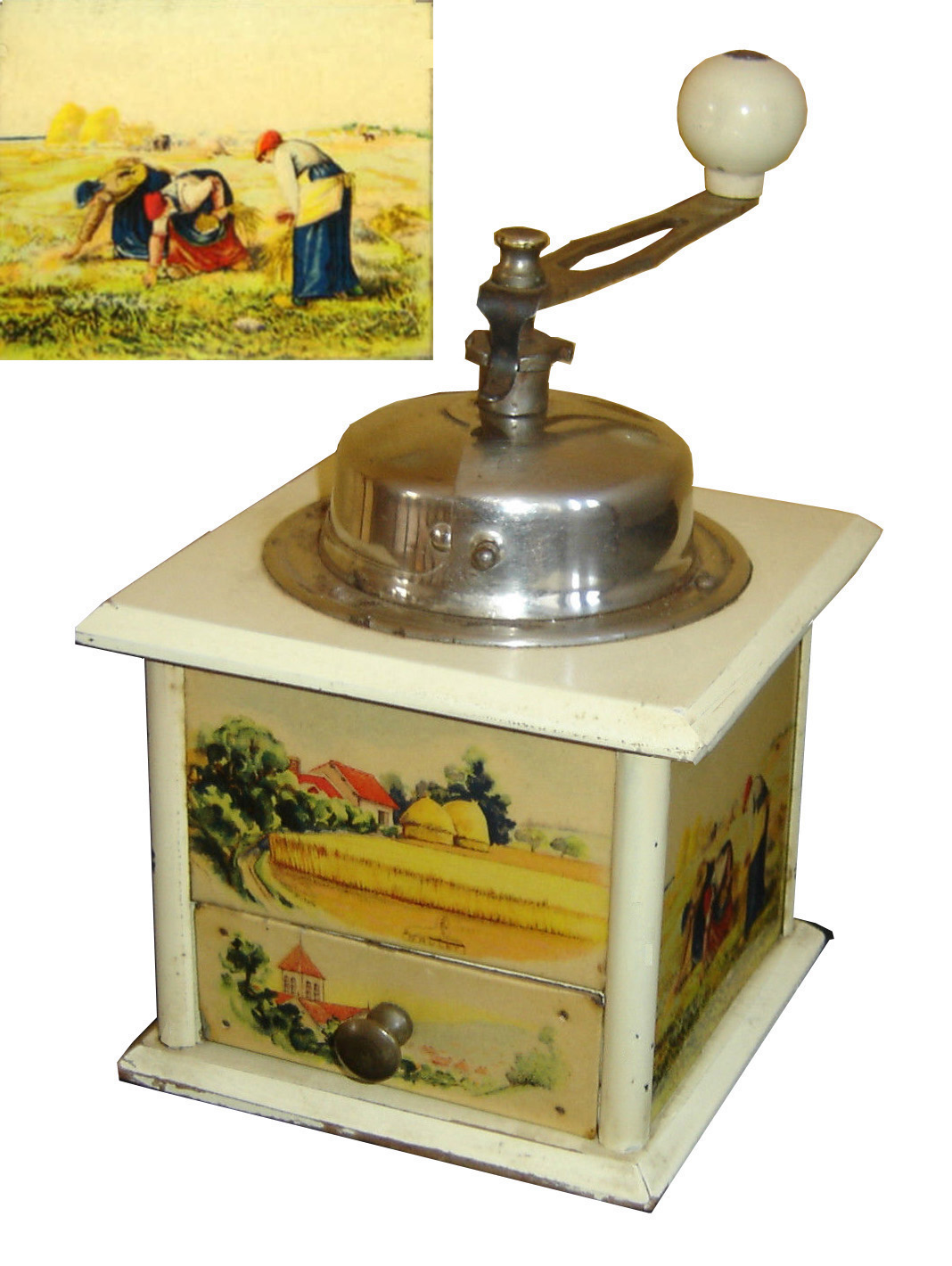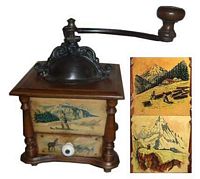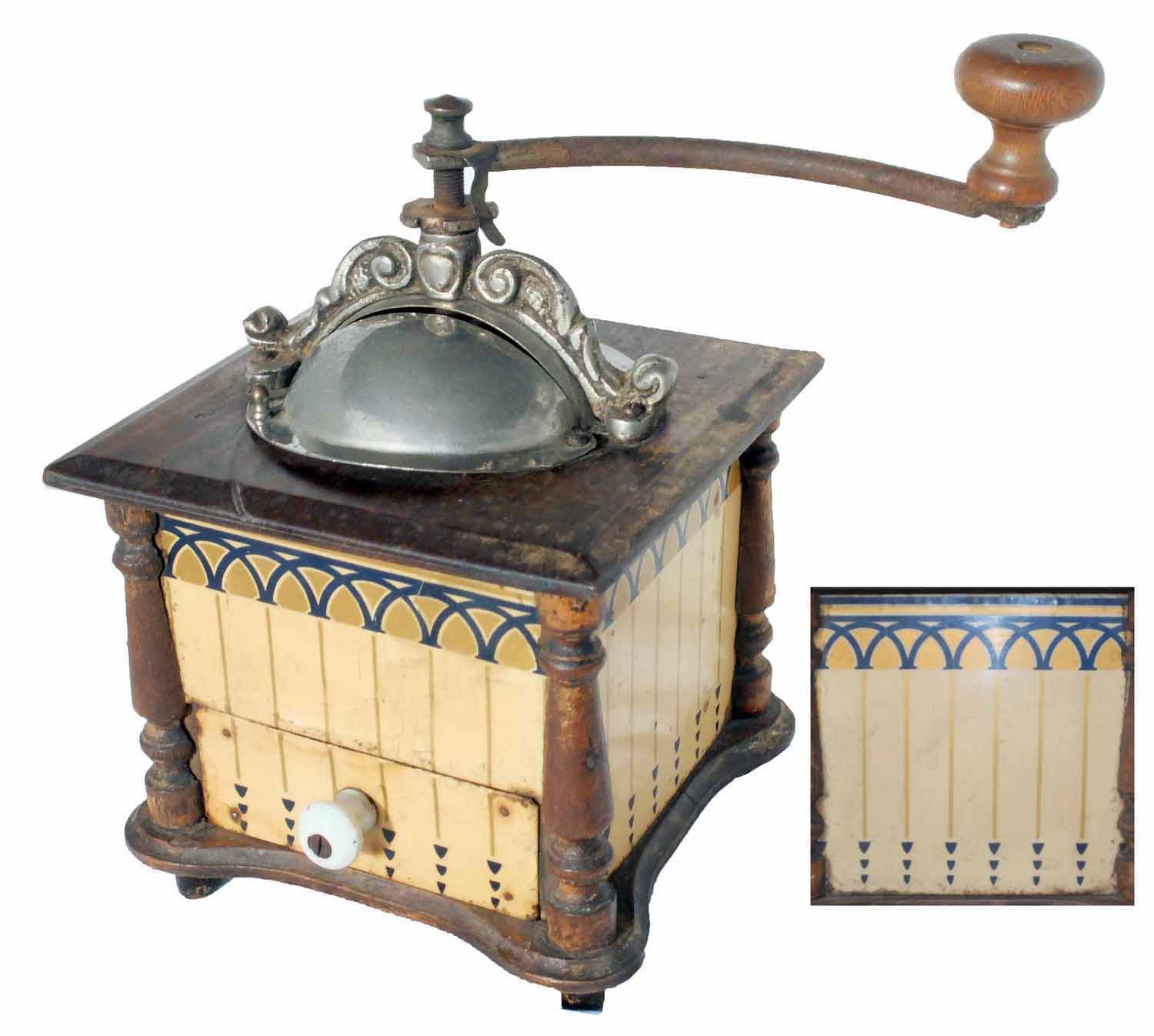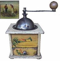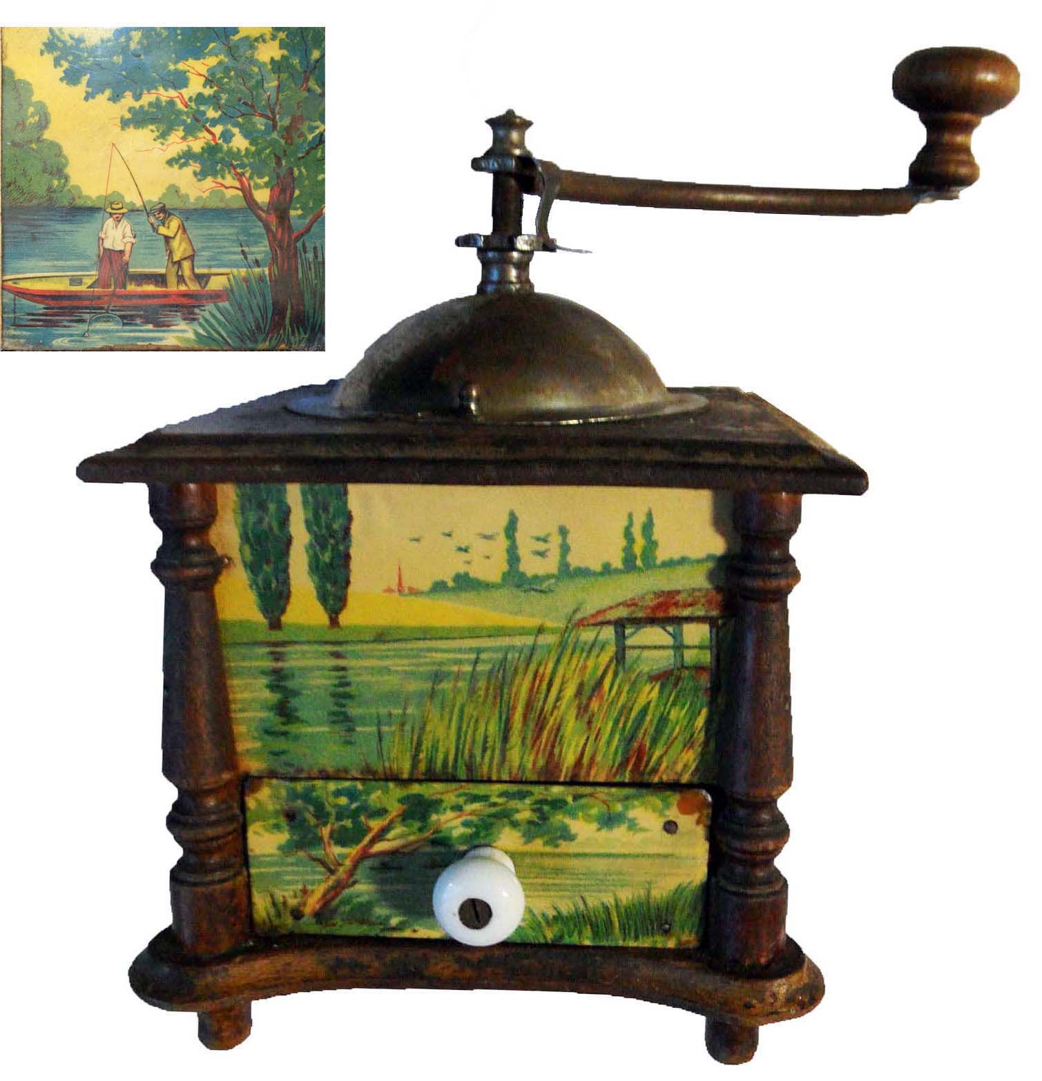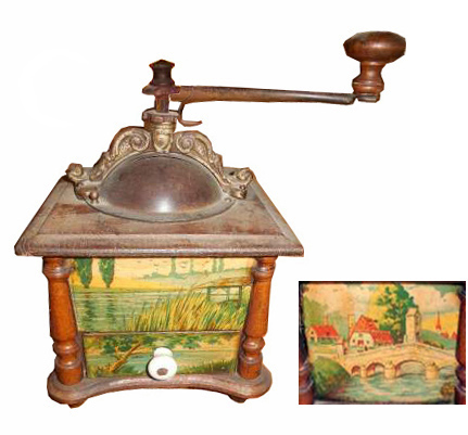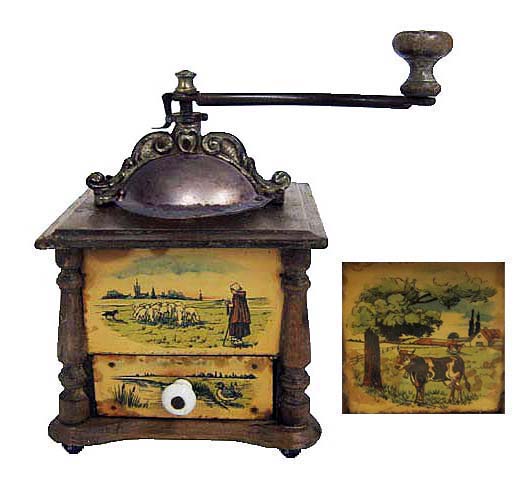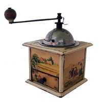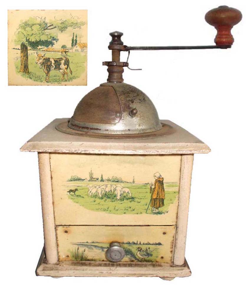 En général, ces moulins comportent 2 images en glacoïde, une pour la façade et une reproduite sur les 3 côtés. Certains décor porte la marque grulet au sphinx au bas de la partie haute de la façade.