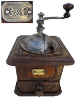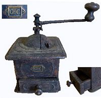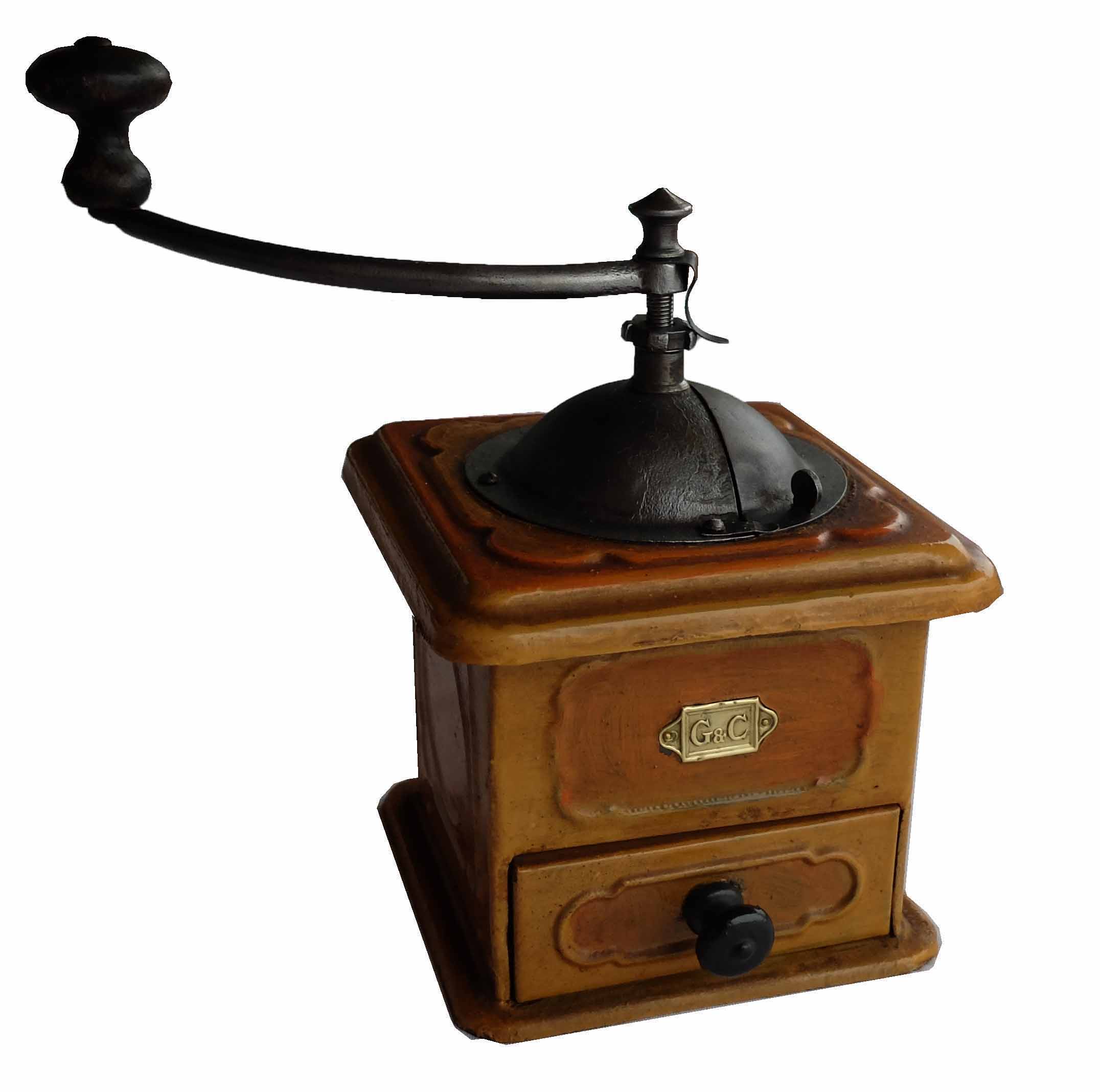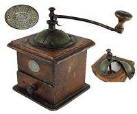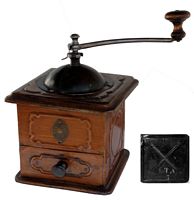 La boite du tiroir est en hêtre assemblée par tenons et le fond cloué. Deux ressorts à lame fixés sur les côtés permettent le blocage pendant la mouture du café. Le bouton du tiroir est en bois verni.
