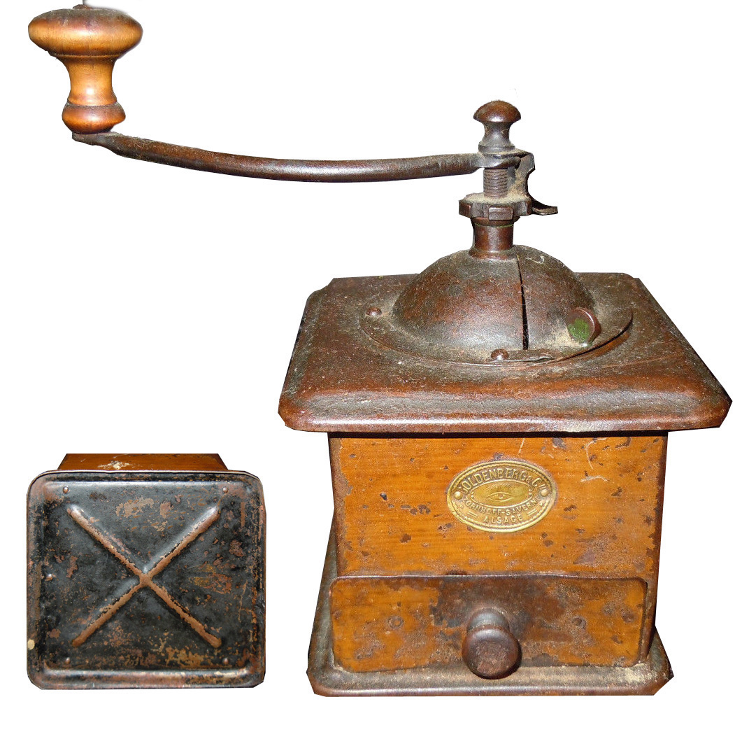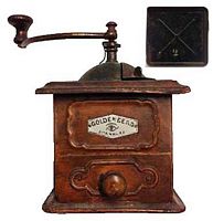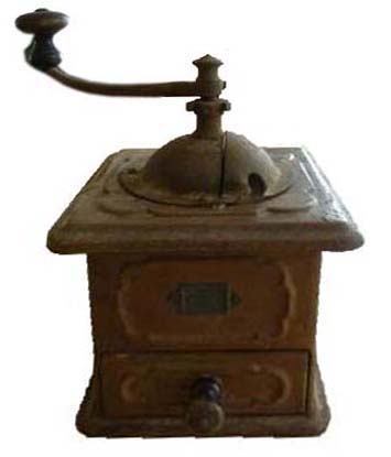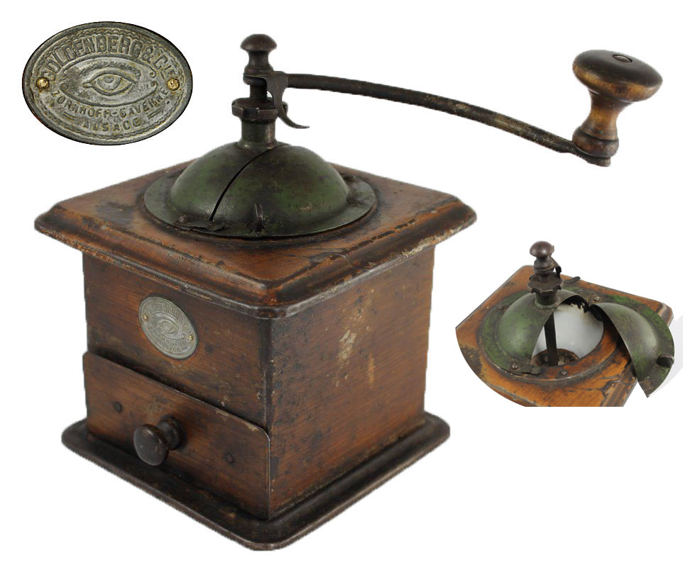 La calotte. en tôle peinte vert, ouvrant par moitié sur le côté droit à l'aide d’un bouton plat, est fixée sur le bloc en bois de la trémie, au travers du dessus en tôle, par trois vis à bois. Un petit ressort à lame maintenu par la vis avant bloque la partie mobile. La trémie qui reçoit le café est en tôle émaillée.