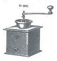 Moulin avec boîte en hêtre verni et trémie extérieure ouverte en laiton sans piédouche.