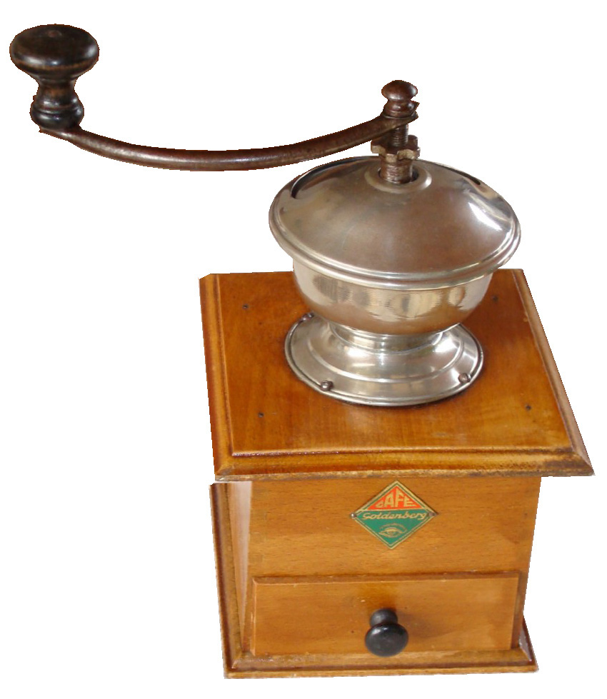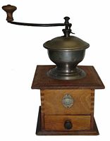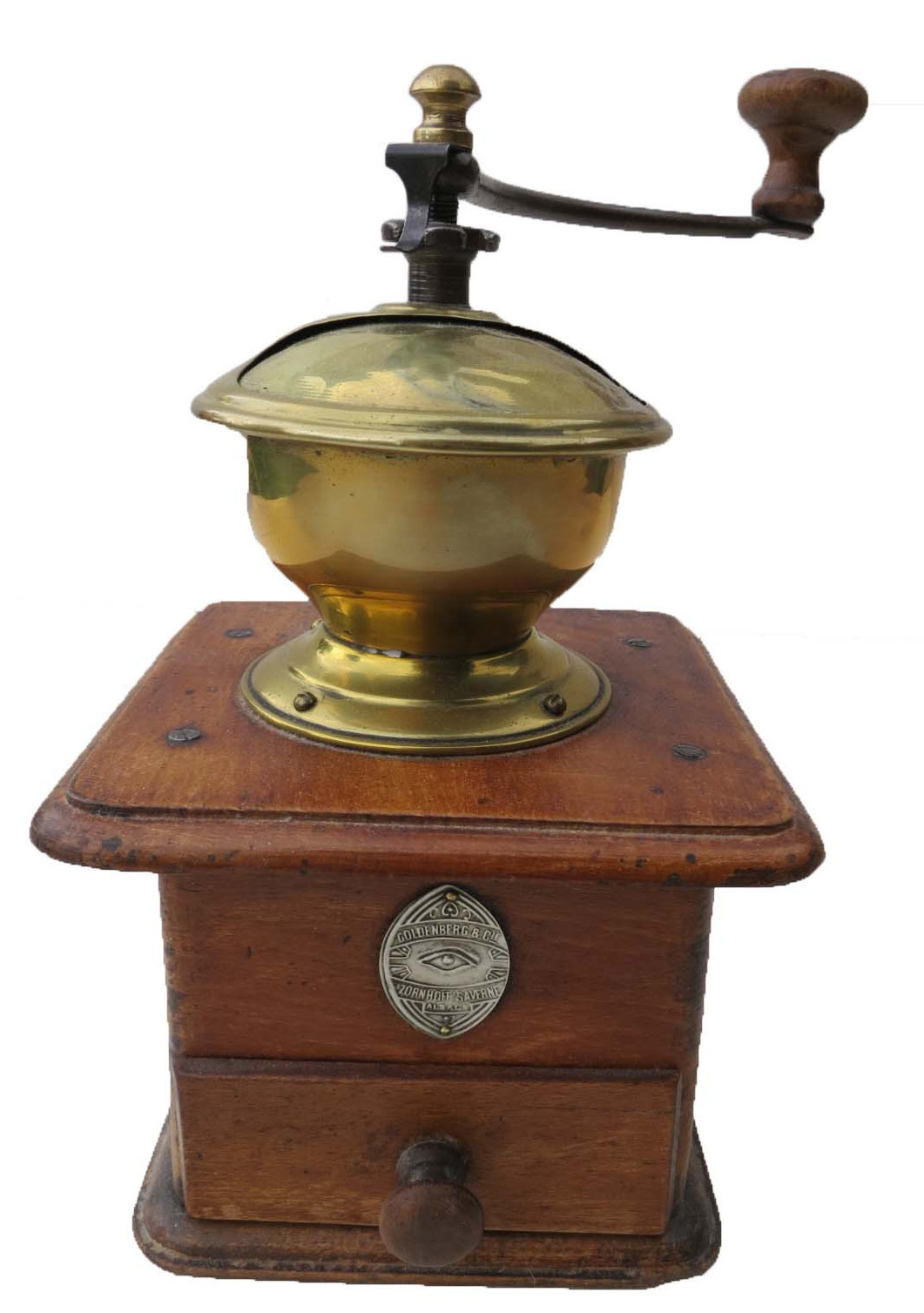 Moulin à trémie extérieure fermée sur piédouche en laiton (HPF) ou nickelée (HPFN), avec boîte en hêtre verni poli assemblée par tenons et mortaises et bords vifs ou arrondis, tiroir en appui.
