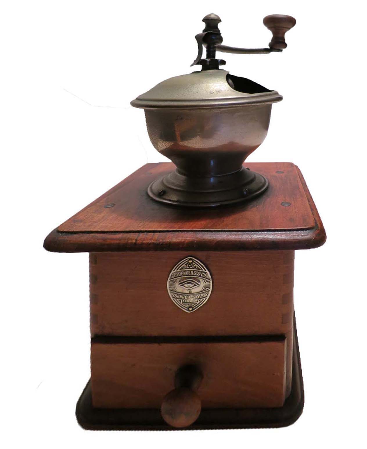 Moulin à trémie extérieure fermée sur piédouche en laiton (HDF) ou nickelée (HDFN), avec boîte en noyer poli assemblée par tenons et mortaises et bords arrondis, tiroir en appui.
