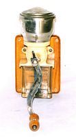 La manivelle plate (épaisseur 3,8 mm), nickelée, en " S ”, n’est pas ajourée mais elle est enflée en son milieu comme la plupart des manivelles des moulins muraux de la société. C'est á cet endroit que se trouve gravée la marque GOLDENBERG, aucune décalcomanie sur la trémie, pas de marquage en relief sur le corps ni de plaque sur la planchette. La poignée en bois verni (longueur 48 mm ) est rivée.