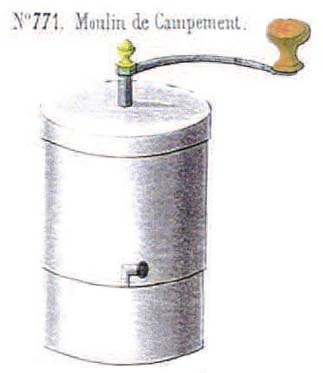 Moulin cylindrique en tôle, le récipient en métal s’enclenche avec une baïonnette.