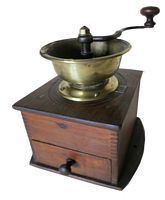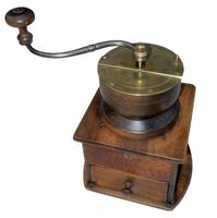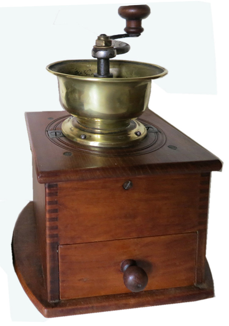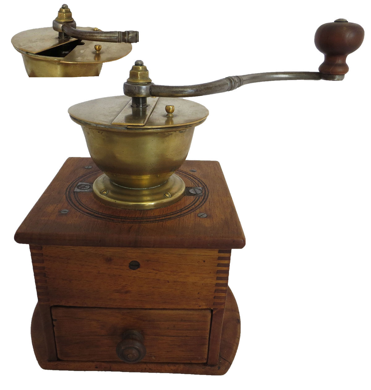 - Trémie en bois tourné, fermeture en laiton renforcée par une traverse, avec manivelle ouvragée en son milieu.