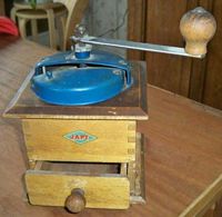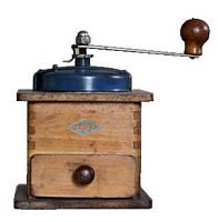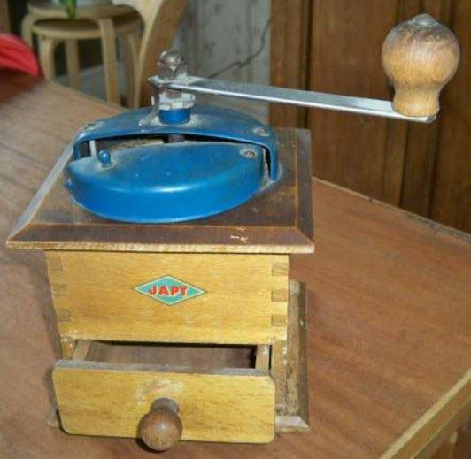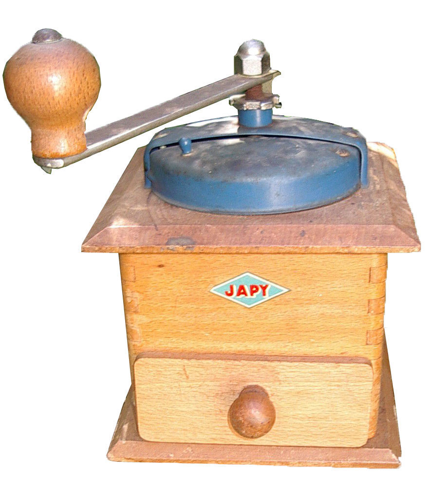 Réglage de la mouture par écrou cranté et ressort. Écrou borgne au sommet de l'axe.