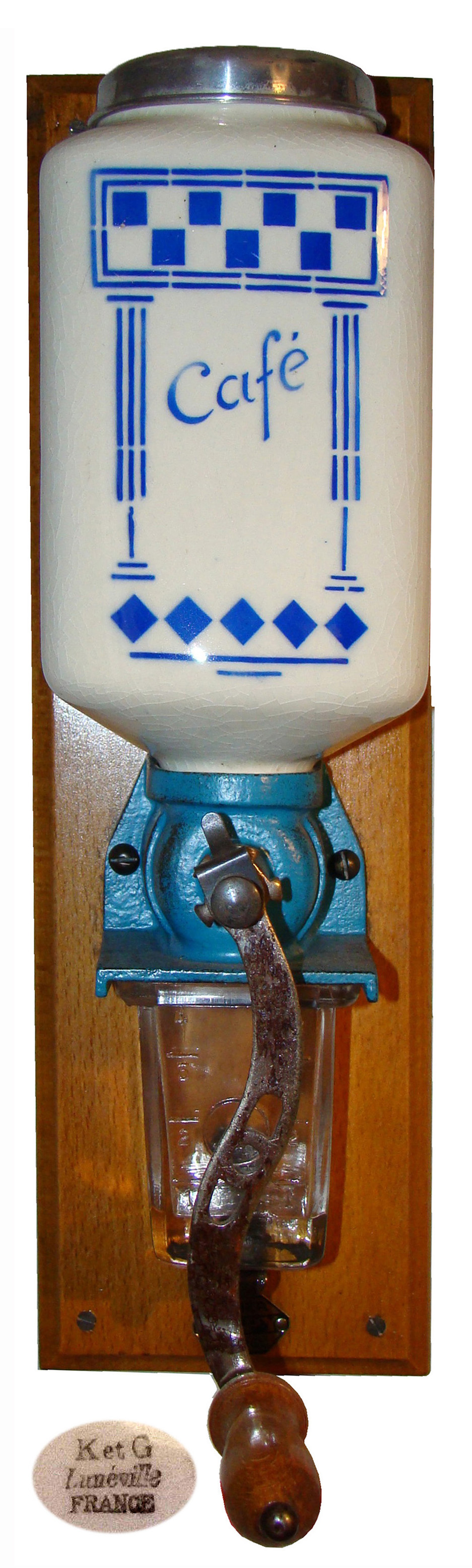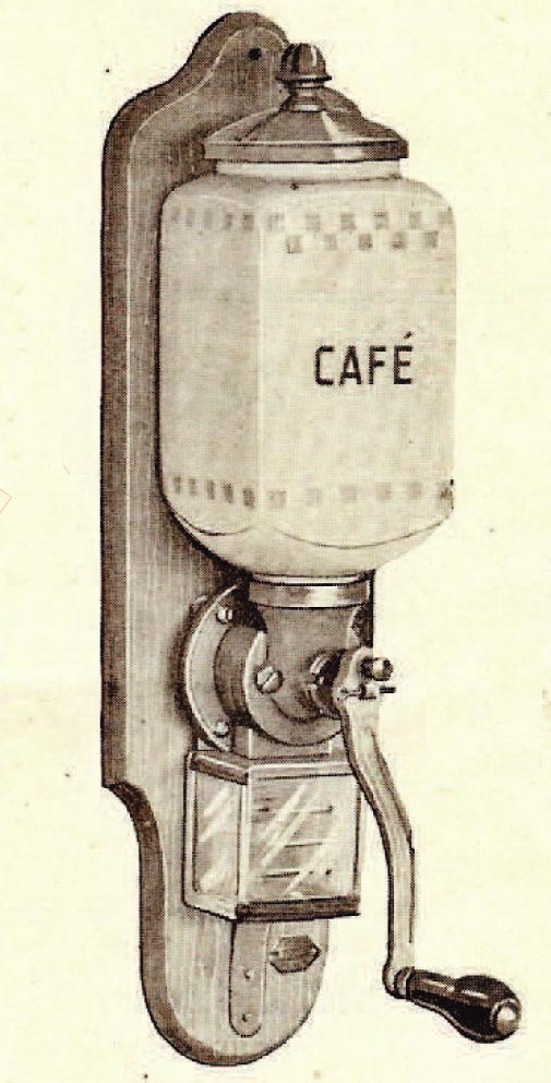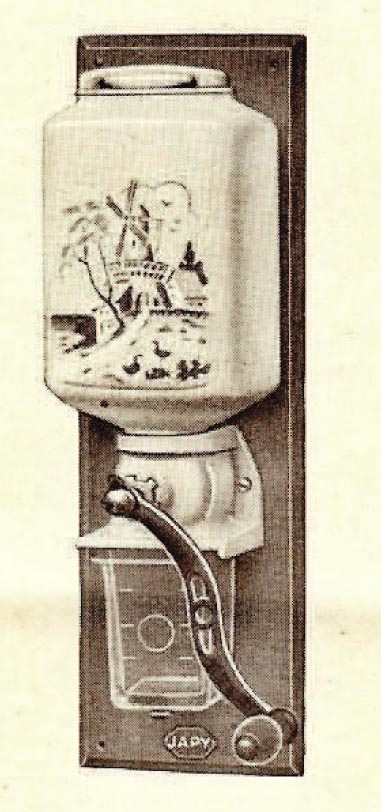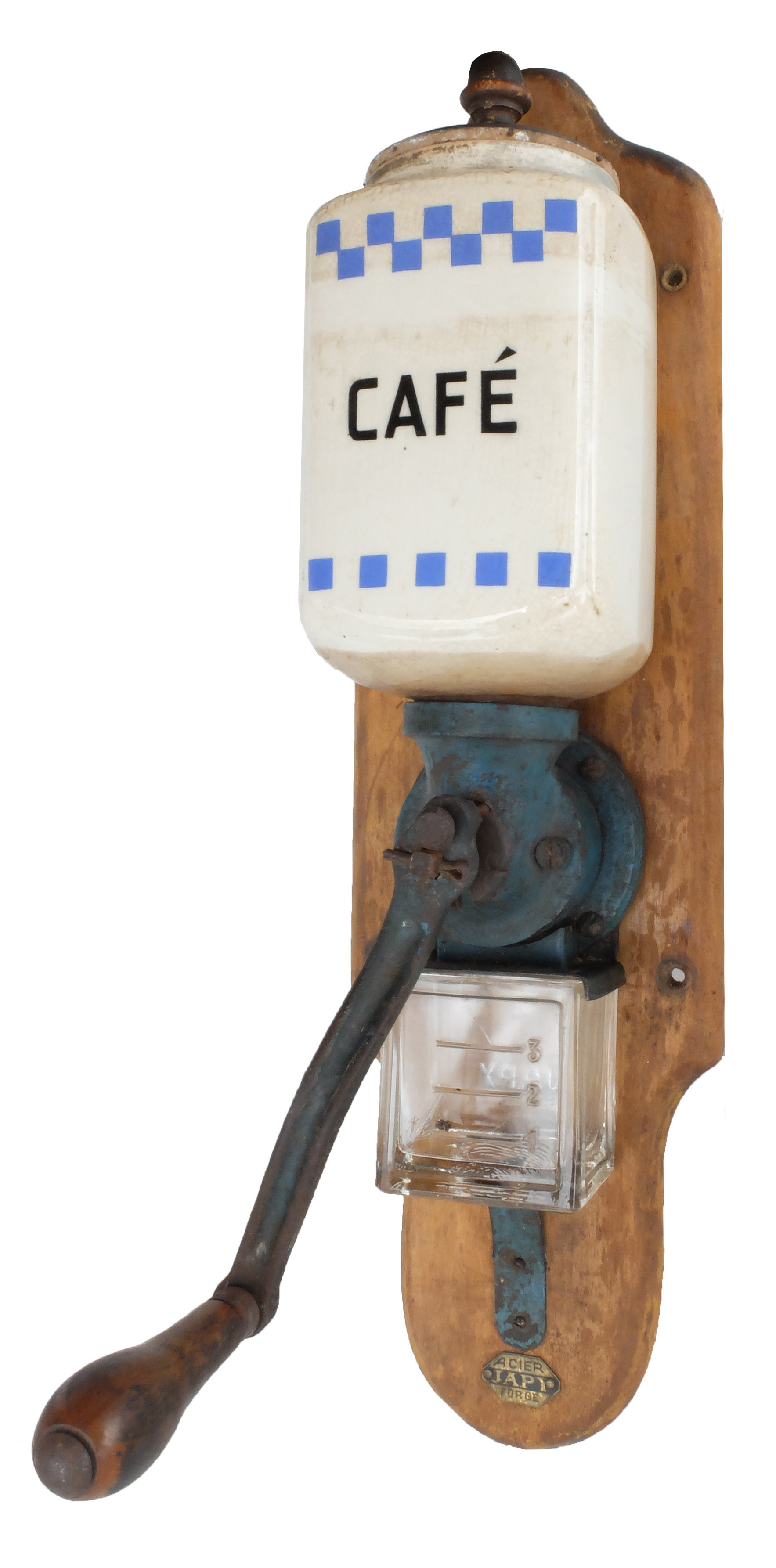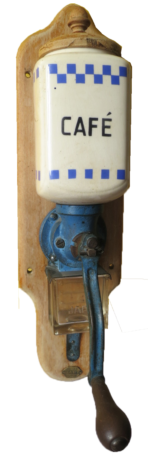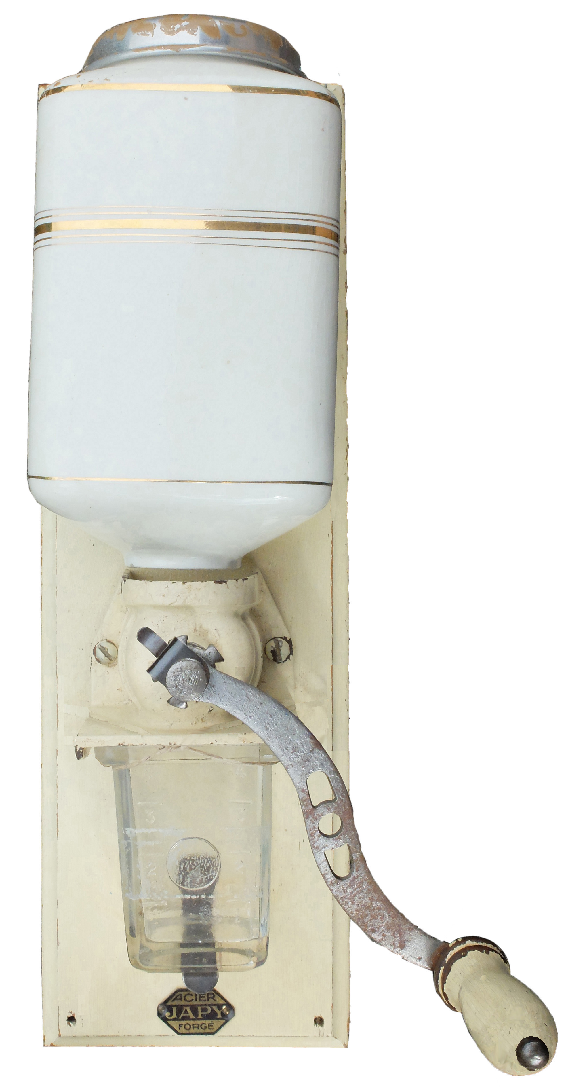 Avec récipient en verre, mécanisme en acier fondu forgé, manivelle en S ajourée et polie ou rainurée à décrochement pour les 500 g, couvercle en aluminium ou en bois. Il existe en 2? tailles 250 et 500 g. Le récipient comporte l'inscription Japy en façade.