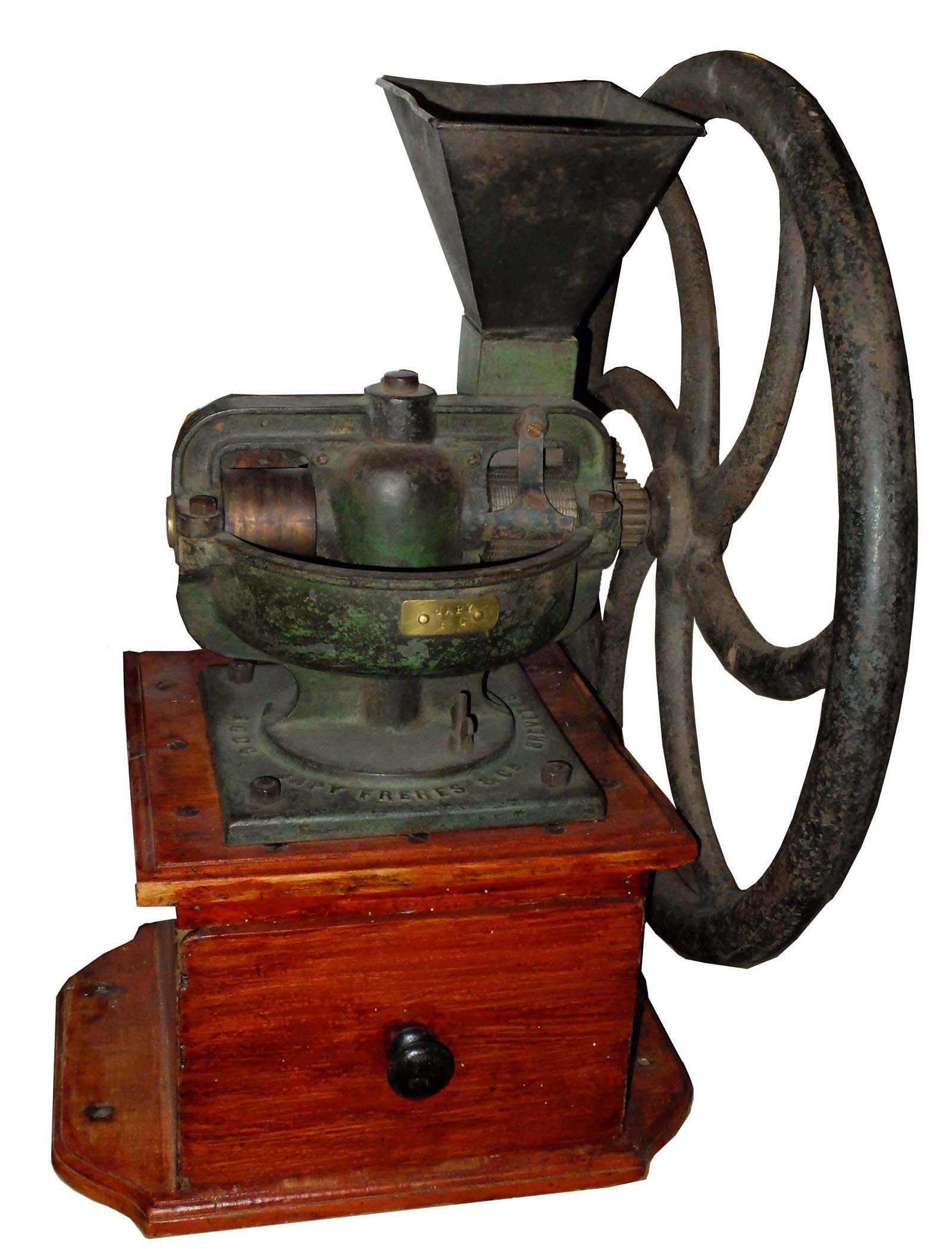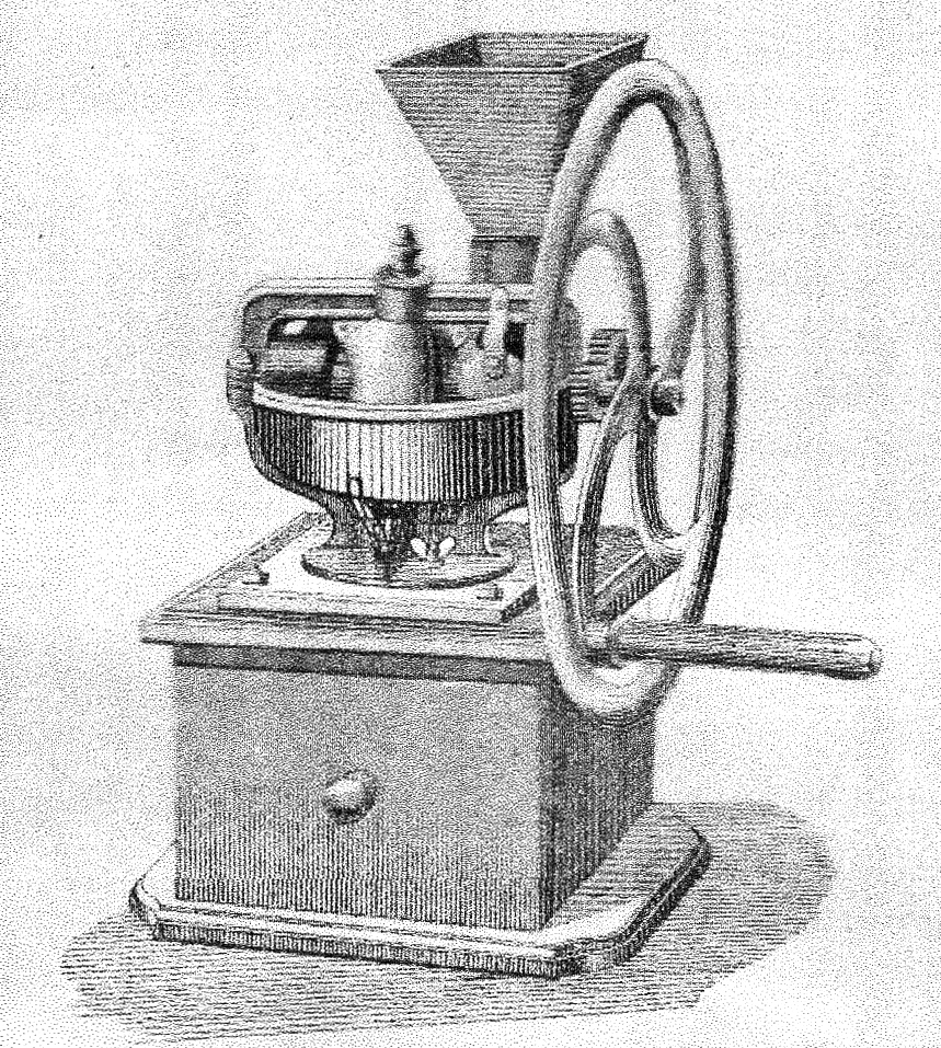 - moulin à graines de lin, sur caisse bois.