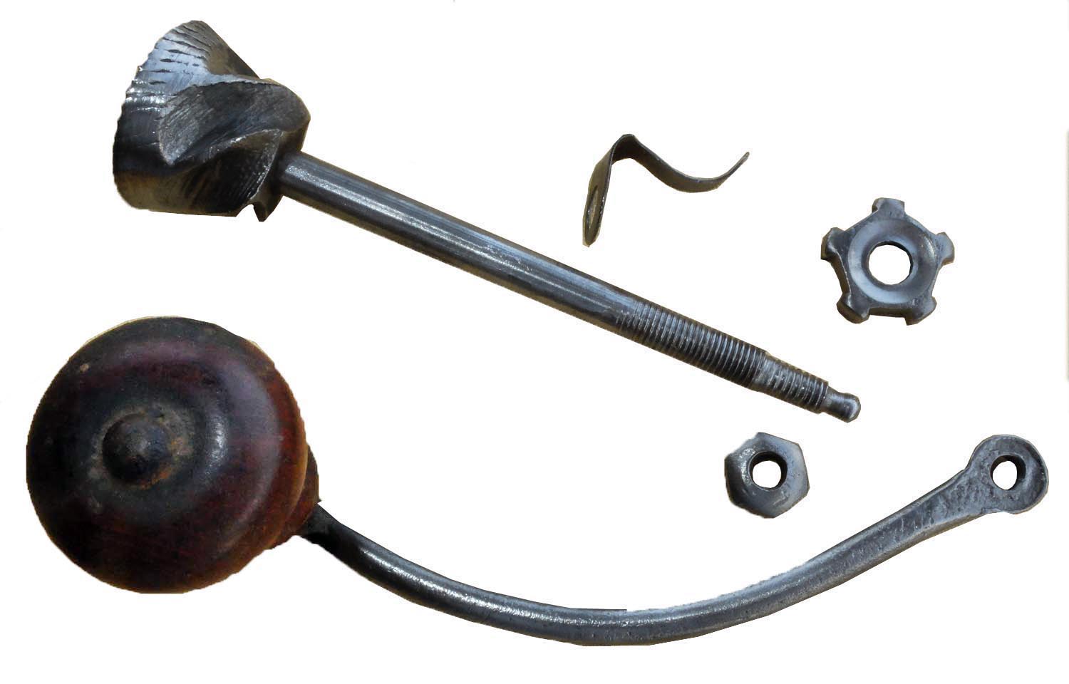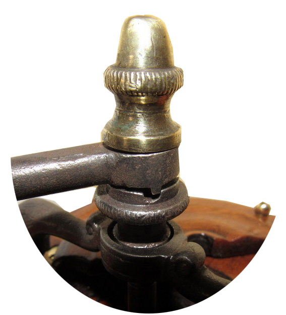 Poli, boîte noyer, couvercle plat en noyer, support en acier forgé bronzé, tiroir encastré. Trémie en bois ou en porcelaine. Chapeau en laiton pointu ou arrondi. Le tiroir est constitué de planchettes en hêtre clouées. Une planchette en noyer est collée en façade. Il ne comporte pas de frein. le plateau supérieur est mouluré.