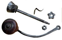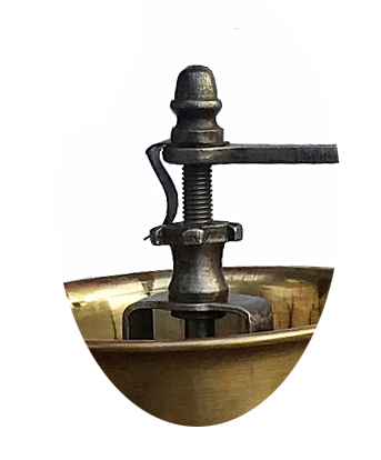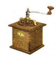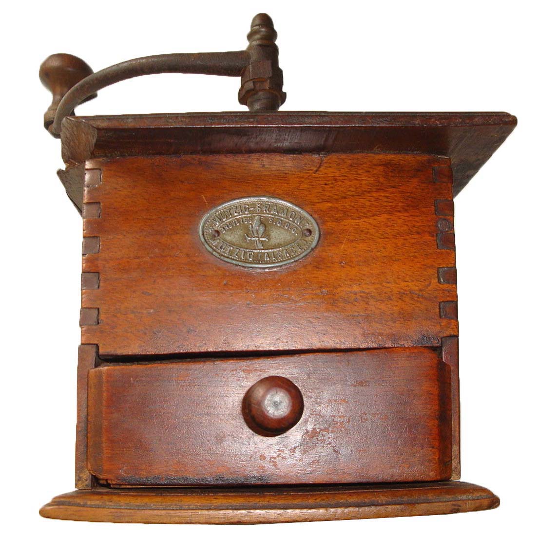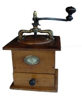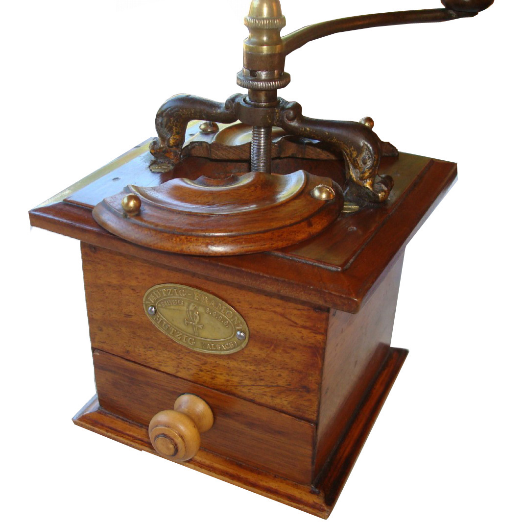 Poli, boîte noyer, couvercle plat en noyer, support en acier forgé bronzé, tiroir en appui. Trémie en bois ou en porcelaine. Chapeau en laiton pointu ou arrondi. Le tiroir est constitué de planchettes en hêtre assemblées par enfourchement. Une planchette en noyer est collée en façade. La forme de la moulure du plateau spérieur est en quart de rond.