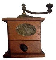 calotte bombée bronzée or, caisse en hêtre verni à angles vifs, clouée, tiroir encastré, largeur de la caisse 70 mm, plateau supérieur mouluré, chapeau pointu, manivelle cintrée avec un carré pour se fixer sur l'axe, mutzig framont gravé sur l'étrier du mécanisme.