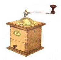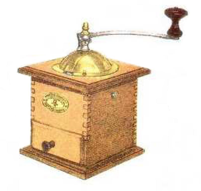 Moulin avec boîte en hêtre poli,assemblé par tenons et mortaises trémie en tôle émaillée, calotte peinte,tiroir en appui, existe avec
