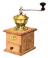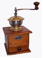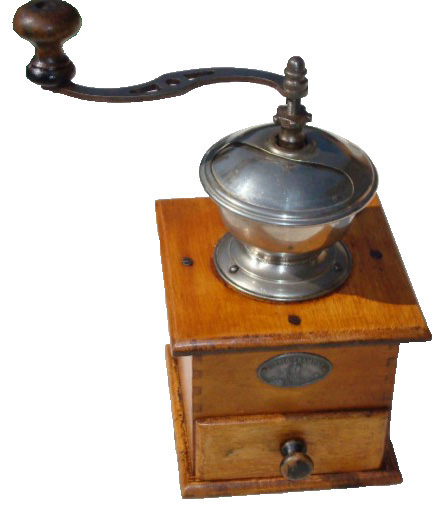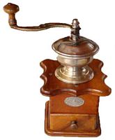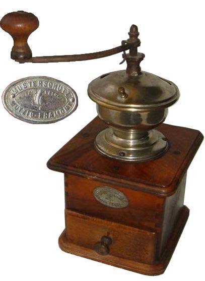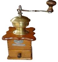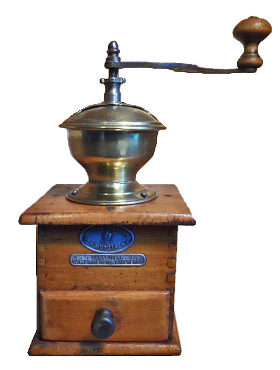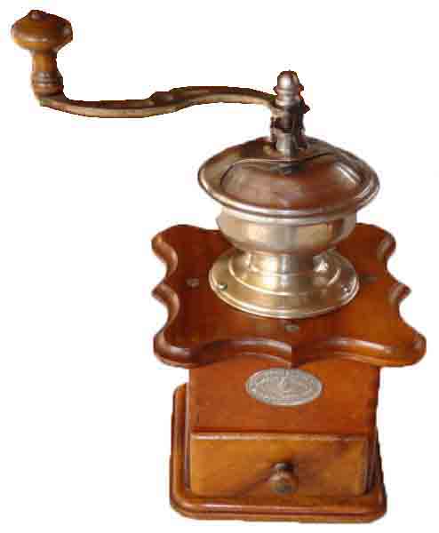 - WFG : noyer, assemblage par enfourchement, angles arrondis, plateau supérieur chantourné, tiroir en appui, trémie en laiton ou nickelée, manivelle cintrée de section