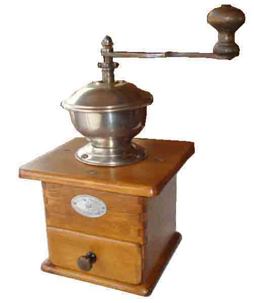 - WF : noyer, assemblage par enfourchement, angles arrondis, tiroir en appui, trémie en laiton ou nickelée, manivelle cintrée de section ronde, en option manivelle plate