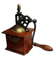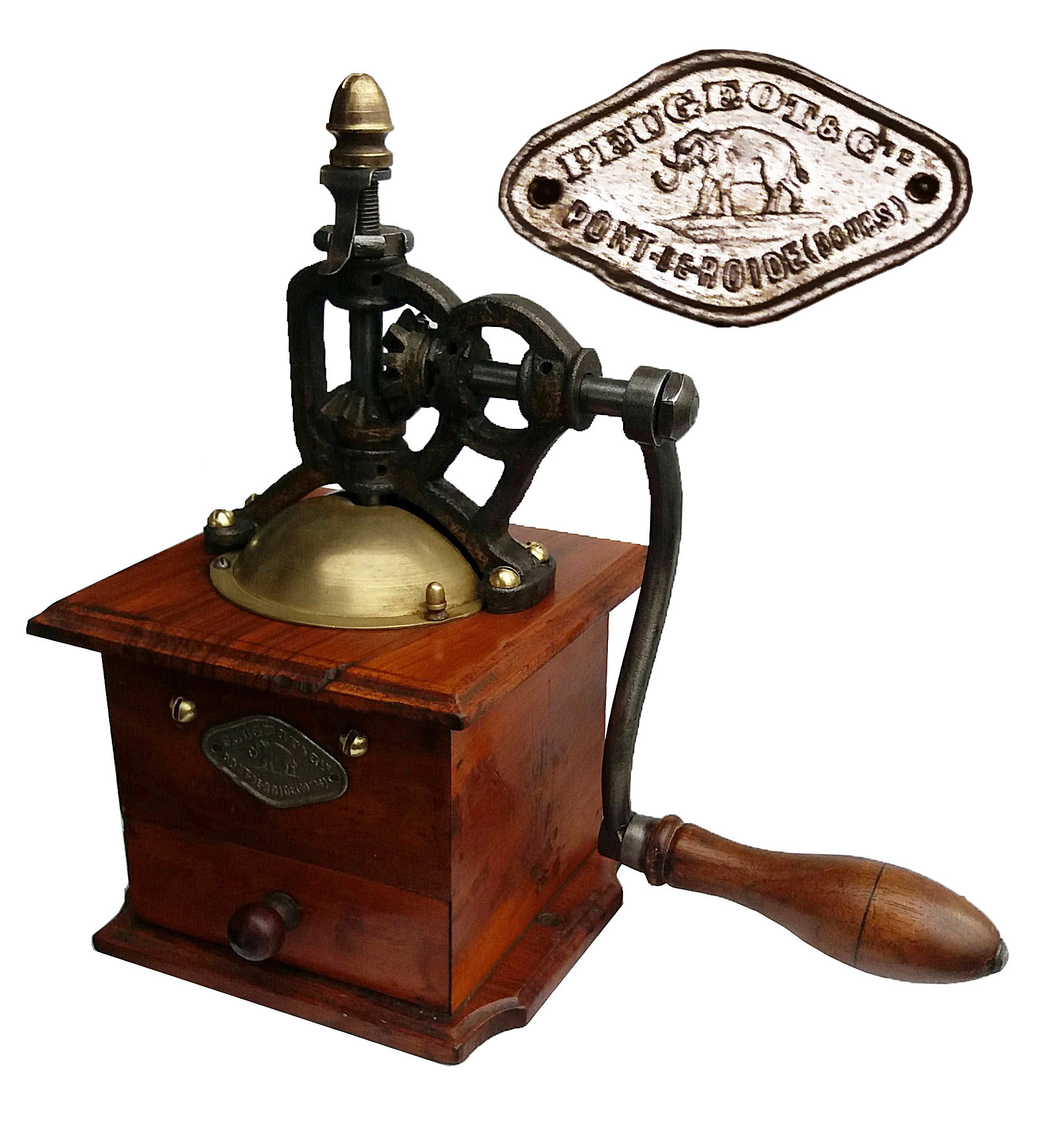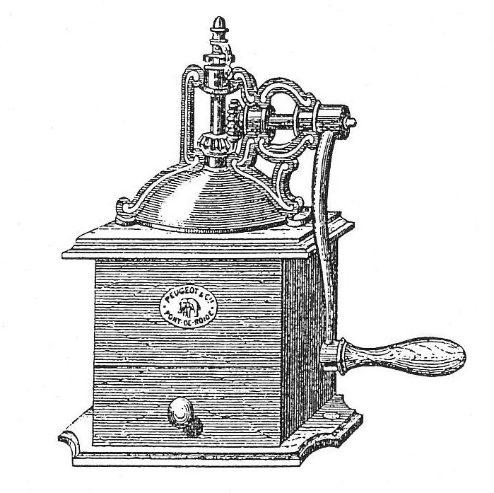 Sont présentés ici les moulins à engrenages d'angle sur caisse bois poli, ou verni, avec calotte en laiton et manivelle en S.