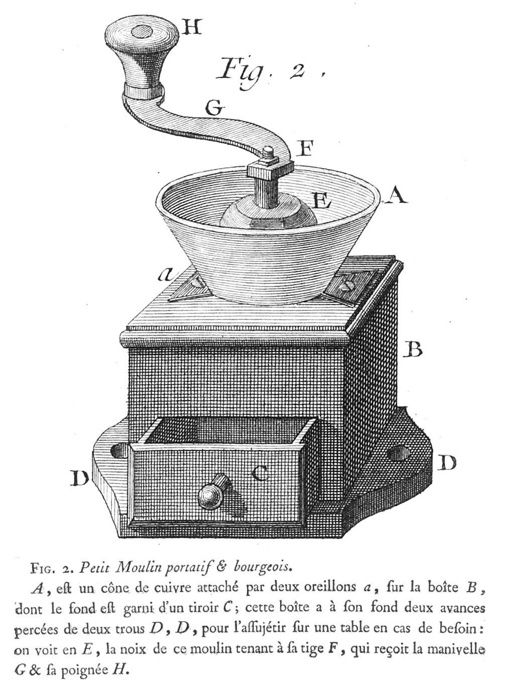 Une illustration de ce type de moulin figure dans "l'art du distillateur liquoriste , contenant le brûleur d'eaux-de-vie, le fabriquant de liqueurs, le débitant ou le cafetier-limonnadier", (1775) par Jacques-François Demachy, (1728-1803)
