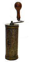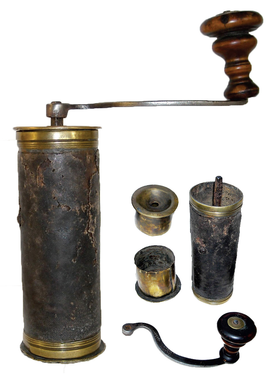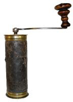 Un couvercle et un godet en laiton s'emboîtent dans le corps du moulin. Il s'agit certainement de l'ancêtre des moulins à café de voyage. La manivelle amovible, légèrement en S, est relativement grande avec un bouton en buis.