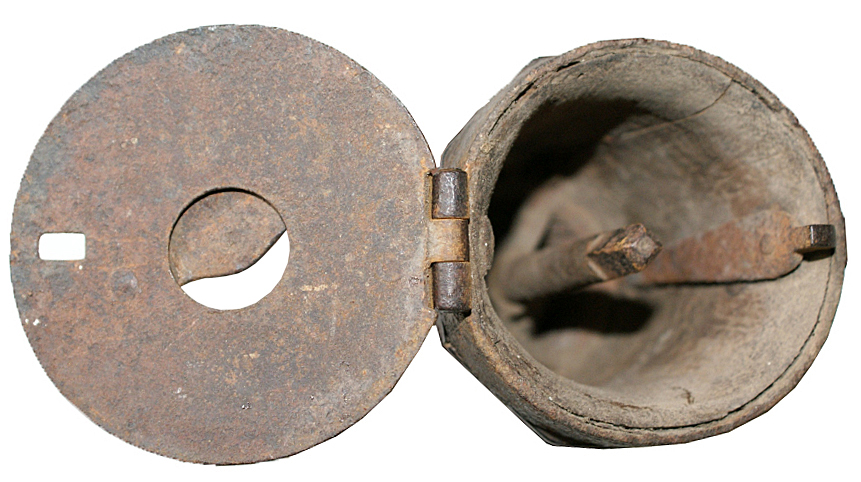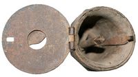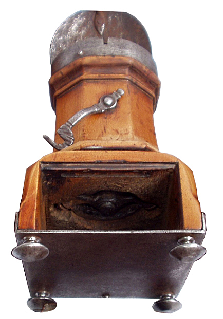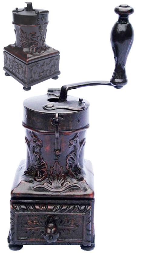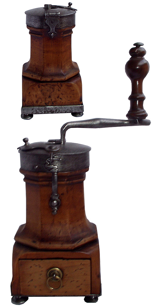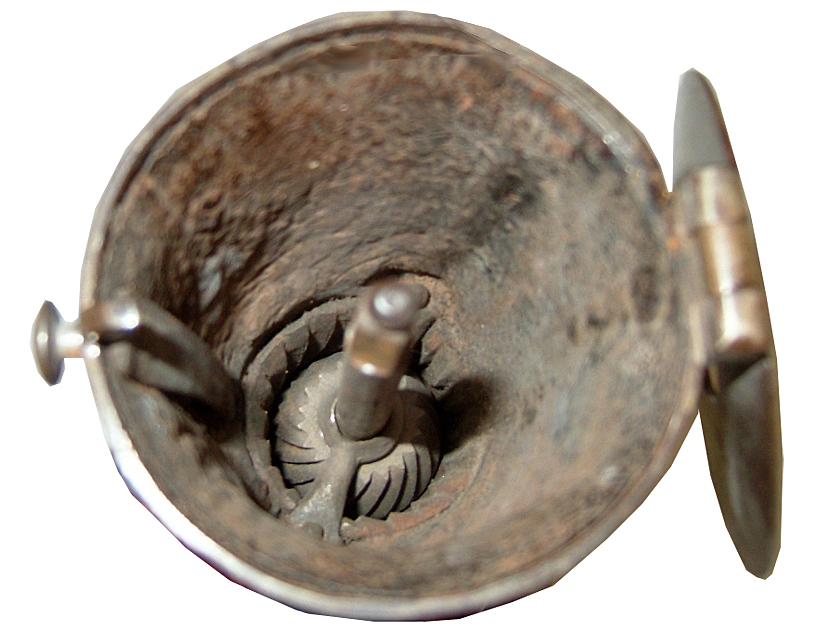 Le couvercle bombé déborde légèrement de la ceinture ; son opercule, maté presque dans l'axe contrairement aux autres modèles Louis XIV, vient en butée sur la charnière, laquelle déborde parfois du bandeau métallique du haut du moulin. La charnière comporte 3 noeuds, à la différence de celle des louis XIV qui en comporte en général 5.