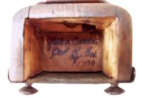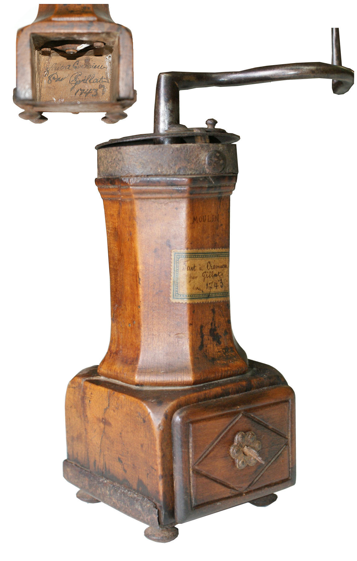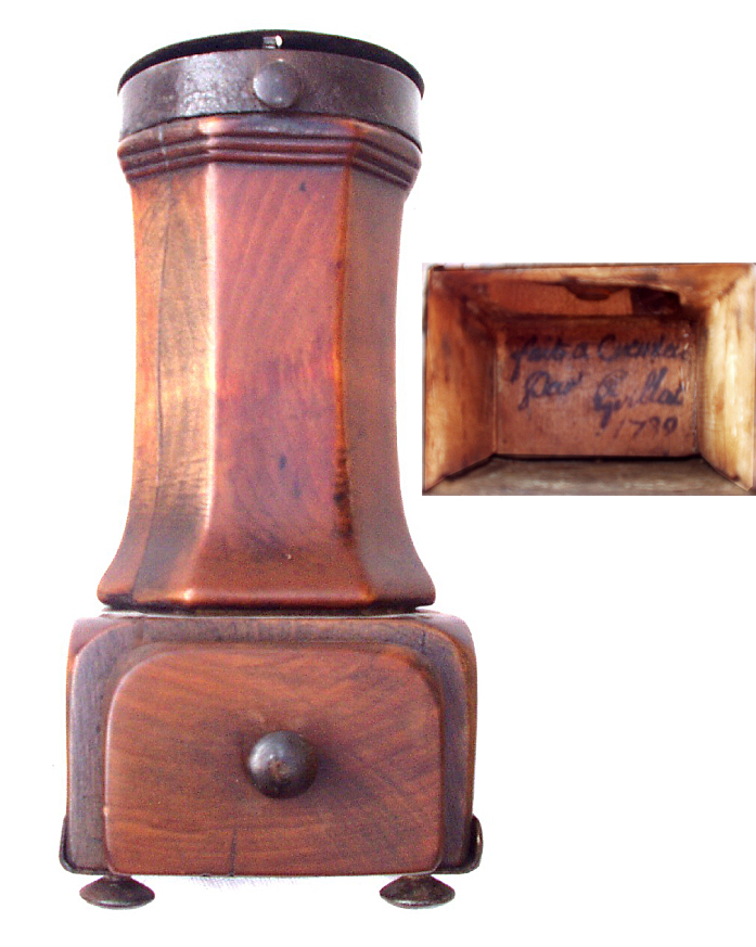 Ces moulins sont souvent signés à la plume à l'encre de Chine à l'intérieur du socle, derrière l'emplacement du tiroir. Y figurent souvent le lieu de fabrication suivi du patronyme et parfois de la date, rédigé selon la formule : «fait à Crémieu /par Grillat /16.. ou 17.. ».