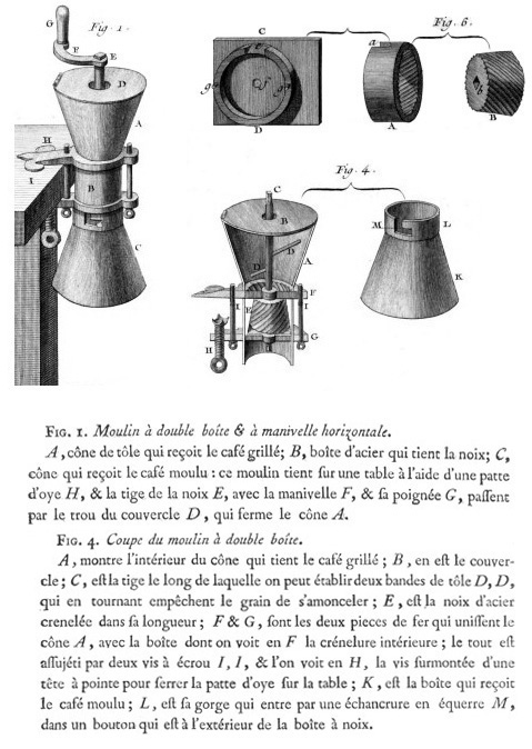Une illustration de ce type de moulin figure dans "l'art du distillateur liquoriste , contenant le brûleur d'eaux-de-vie, le fabriquant de liqueurs, le débitant ou le cafetier-limonnadier", (1775) par Jacques-François Demachy, (1728-1803)